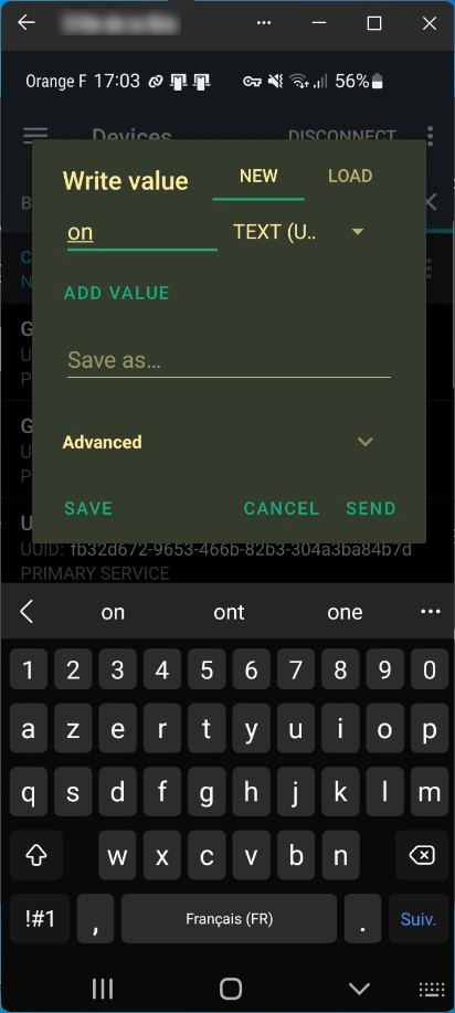 On écrit la valeur “on” dans la caractéristique du service. La LED en surface de la carte devrait s’allumer aussitôt après l’appui sur le bouton Send.